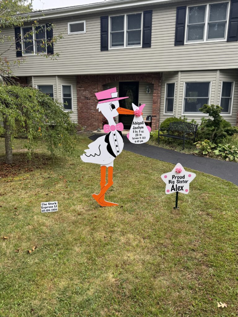 A birth announcement stork sign rental service in long island serving Bohemia, Sayville, Bayport, Bluepoint, West Sayville, Great River, East Islip, Islip, West Islip, Islip Terrace, North Great River, Holbrook, Ronkonkoma, Lake Ronkonkoma, Patchogue, Holtsville, Bayshore, North Bayshore, Brightwaters, Islandia, Brentwood, Medford, Farmingdale, Centereach, Hauppauge, North Babylon, Deer Park, Stony Brook, Mount Sinai, Smithtown, Babylon Village, Lindenhurst, Amityville and More