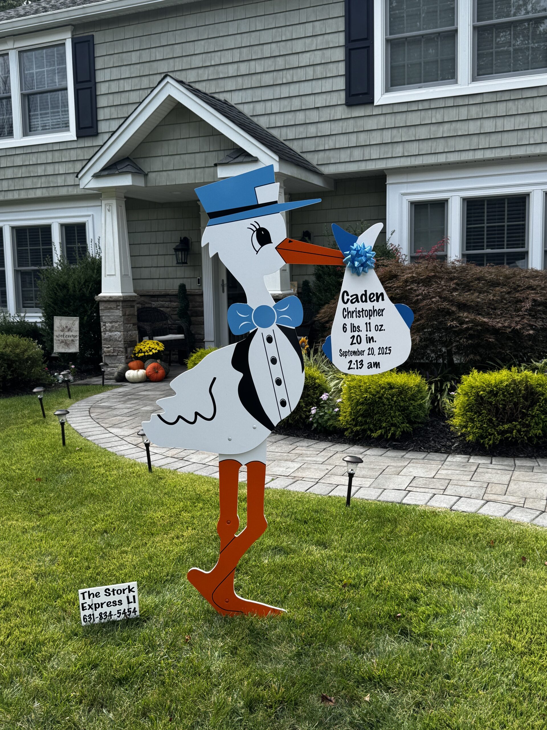 You can rent a pink or a blue stork sign for 7 or 10 days. It includes a bundle with a generic message ‘It’s a grandson’ or ‘It’s a Granddaughter’ and is not left behind as keepsake.